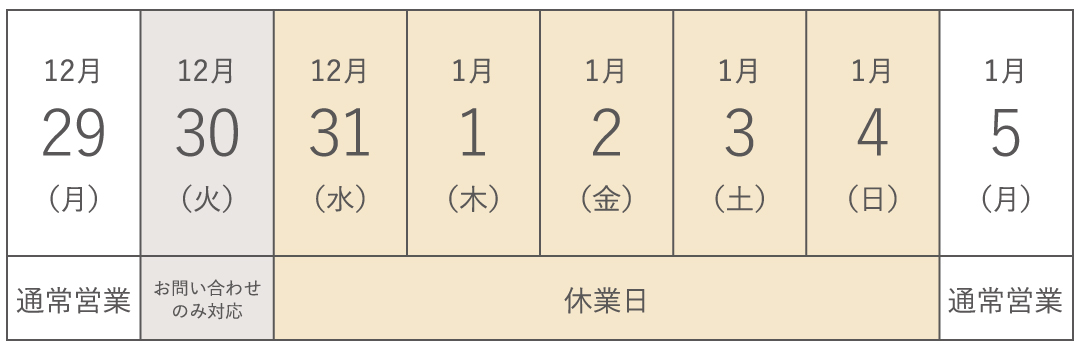 メールでのお問い合わせは休業期間中も受け付けておりますが、営業日に順次対応いたします。